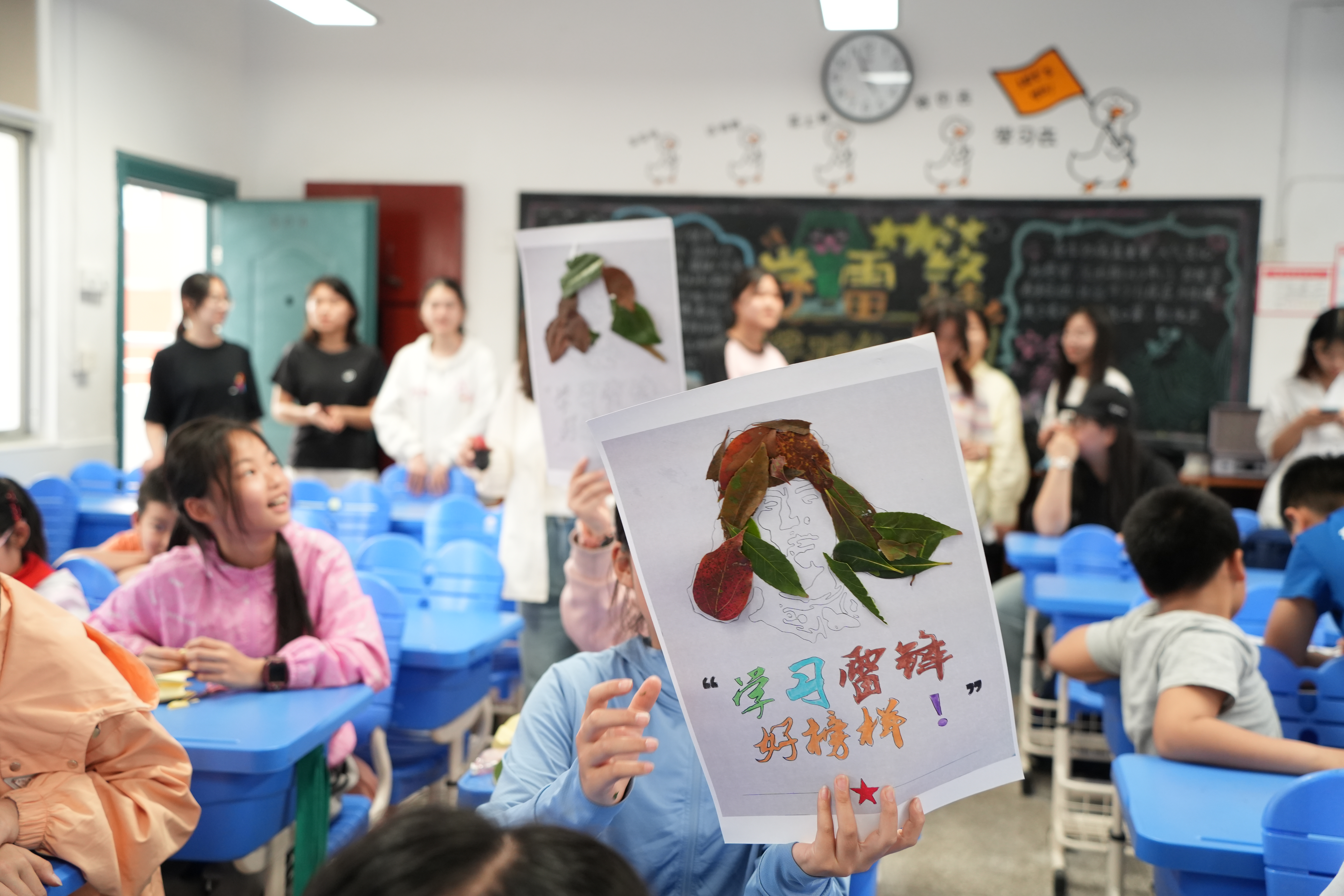 活动中,党员们用生动活泼的语言为孩子们讲述雷锋冒雨送大娘、义务搬砖等感人事迹。孩子们踊跃发言,分享对雷锋精神的理解,在趣味问答环节中,通过互动问答,加深了对助人为乐精神的认识。手工制作环节中,孩子们在党员指导下,利用收集的落叶创作创意拼贴画,有的用柳叶勾勒雷锋肖像,有的用花瓣拼出“为人民服务”字样,将环保理念融入艺术创作。活动现场气氛热烈,完成的作品赢得阵阵掌声。