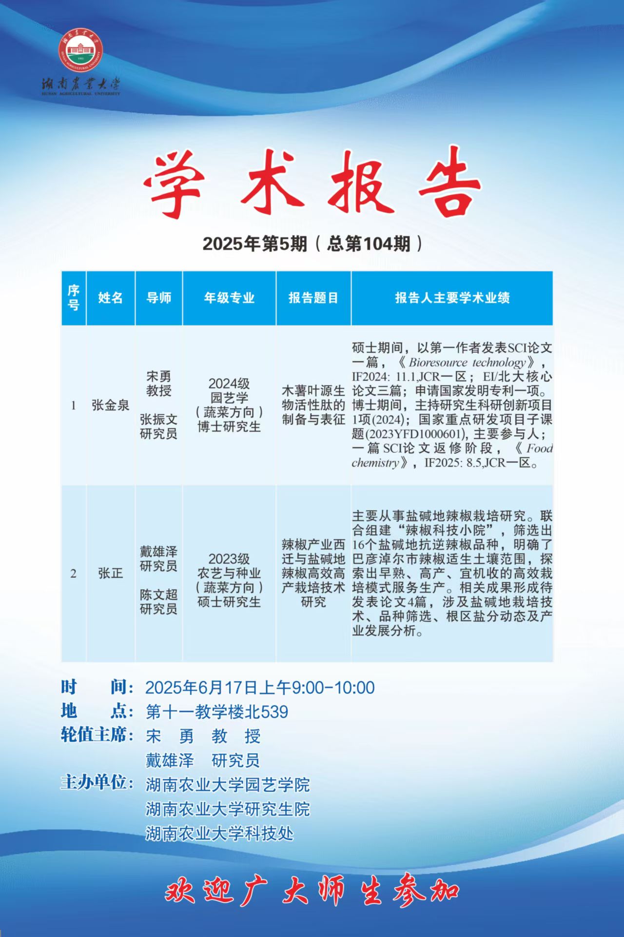园艺讲坛第104期-博学讲坛:木薯叶源生物活性肽的制备与表征 辣椒产业西迁与盐碱地辣椒高效生产栽培技术研究