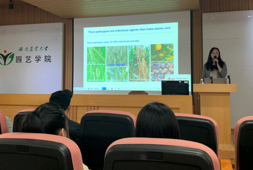报告以植物抗病PTI和ETI基础免疫反应作为切入点,首先介绍了ETI反应过程中TNL类型的NBS抗病基因的相关研究进展;随后讲述通过蛋白互作验证发现Roq1能介导宿主识别病原菌保守蛋白XopQ和HopQ1,讲解利用蛋白晶体结构解析蛋白互作机制并证明其在保护作物免受病菌危害方面具有应用价值。报告结束后,在场师生与齐天从教授进行了交流。