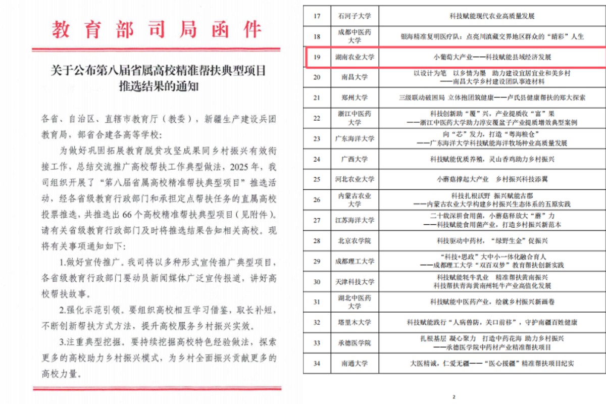 本网讯(园艺学院 金密)近日,教育部公布第八届省属高校精准帮扶典型项目推选结果,我院《小葡萄大产业——科技赋能县域经济发展》项目成功入选。