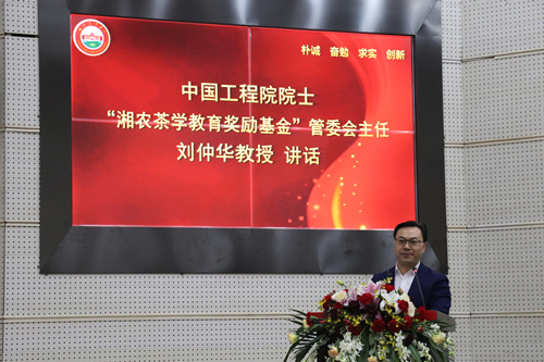 湖南农业大学园艺学院“湘农茶学教育奖励基金”是为激励茶学学科学生和优秀教师热爱茶学事业,勇攀教学、科研高峰,由湖南省茶业集团股份有限公司、湖南金井茶业有限公司、湖南潇湘茶业有限公司、湖南浩茗茶业食品有限公司、湖南华莱生物科技有限公司、湘丰茶业集团有限公司、茶陵茶祖印象茶业有限公司、桂东县玲珑王茶叶开发有限公司、湖南茗膜生物研发科技有限公司、湖南省植物提取物协会等 10 家在湘涉茶单位于 2018年发起并设立的。“湘农茶学教育奖励基金”管理委员会主任由中国工程院院士刘仲华教授担任。