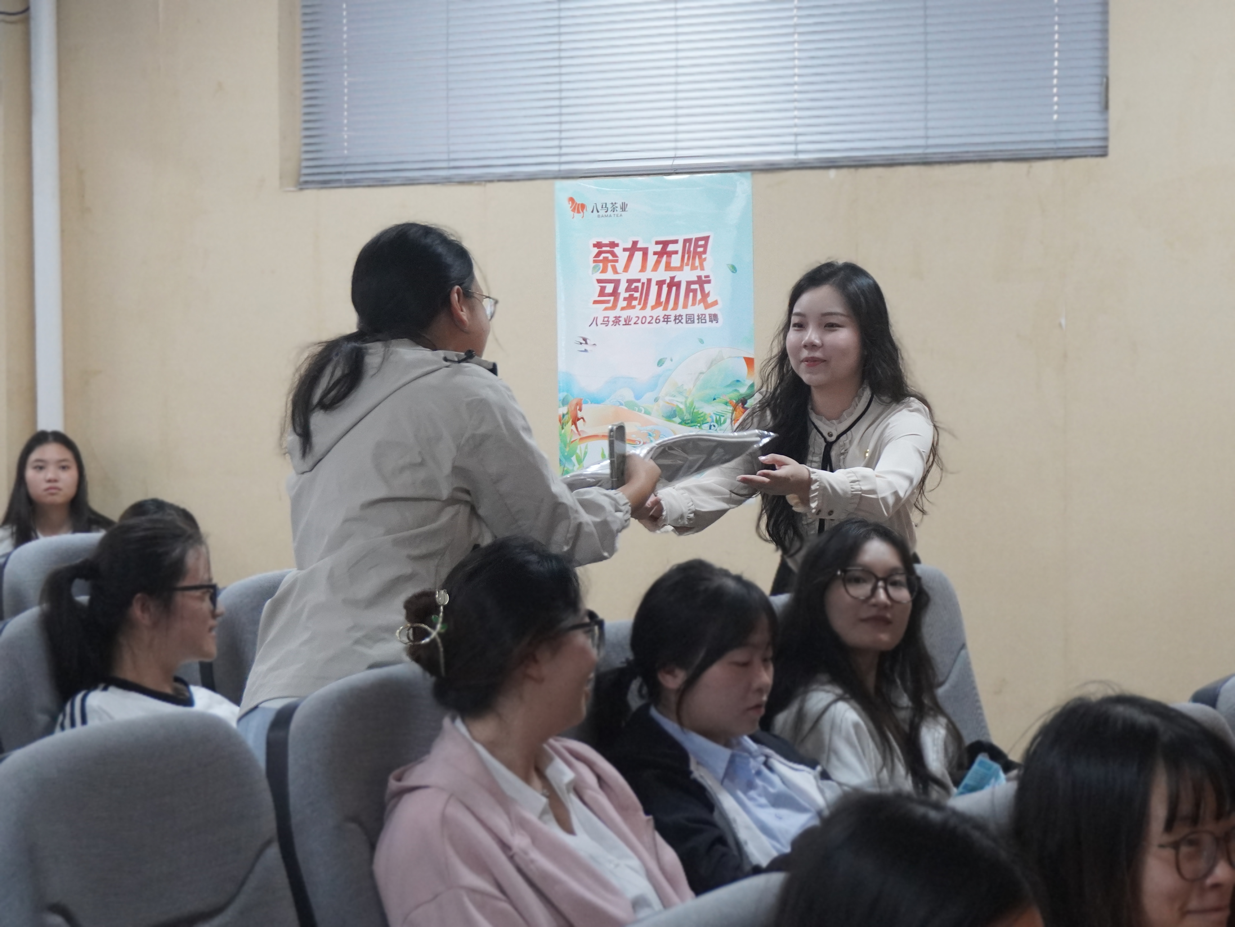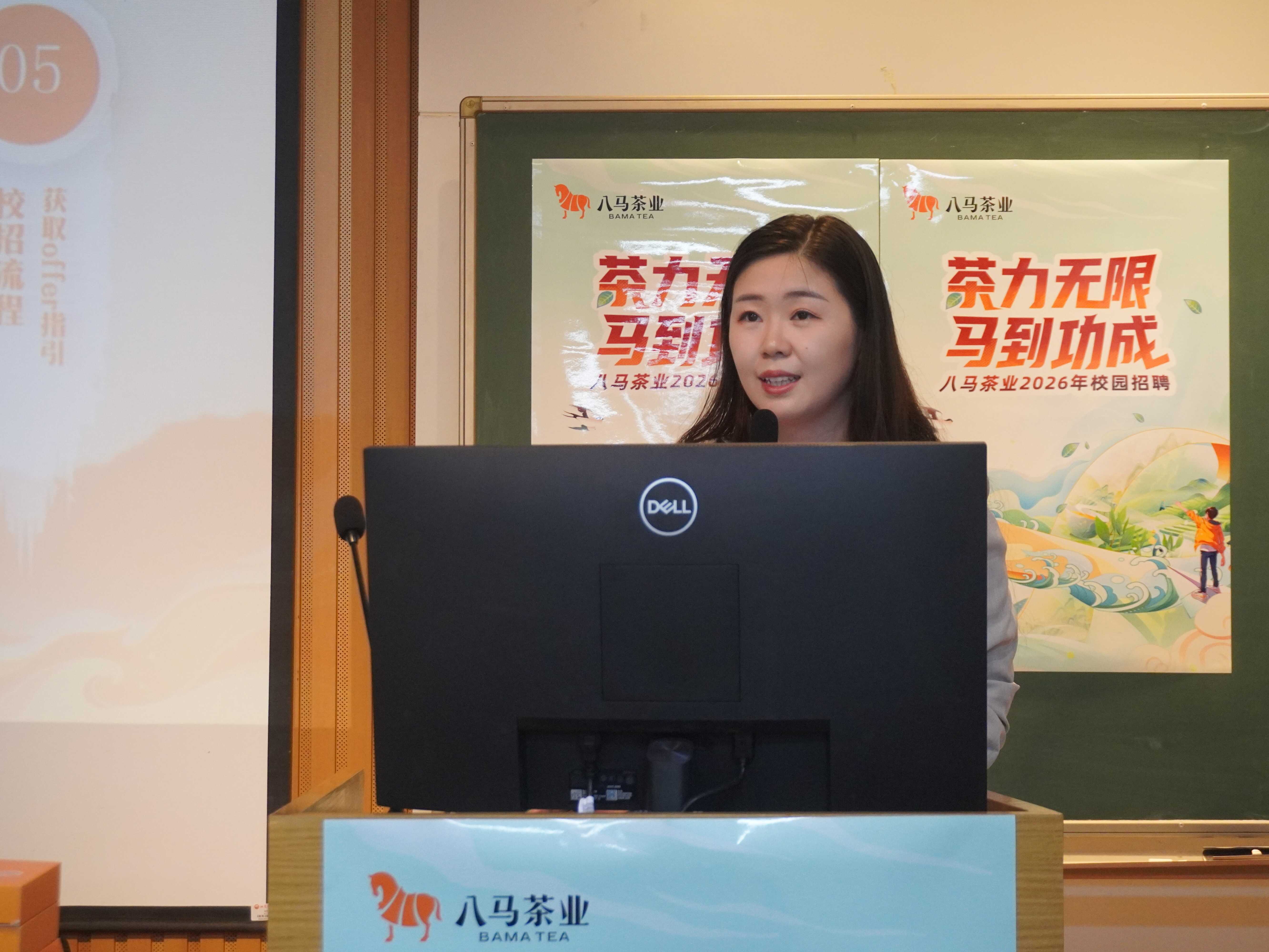 本场招聘会以“茶力无限,马到功成”为主题,由八马茶业人力资源负责人杨舒婷主讲,面向园艺学院2026届毕业生开展企业宣讲和现场交流。宣讲人从公司背景、业务板块、企业文化、招聘岗位及培养体系等方面进行了全面介绍,重点解读了面向应届毕业生打造的“青马计划”专项培养项目。